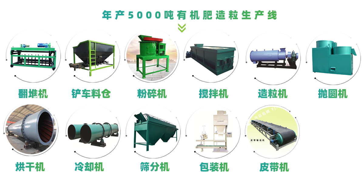 主要是將物料(牛糞.羊糞.豬糞.雞糞.污泥.稻草.玉米秸)等動物糞便有機廢棄物經(jīng)過發(fā)酵腐熟以后含水分約30%-35% 的有機廢棄物經(jīng)粉碎篩分后,與黏結(jié)劑(膨潤土.腐殖酸)及需配比的其他成分的原料按配比要求在配料混合系統(tǒng)中進行計量、(添加功能菌可生產(chǎn)生物有機肥,添加氮、磷、鉀(總養(yǎng)分含量低于15%)可生產(chǎn)有機無機肥)配料、混合,經(jīng)充分混合后的物料由皮帶輸送機均勻連續(xù)的喂入造粒機中,經(jīng)拋光整形機拋圓成球狀顆粒,經(jīng)烘干機進行低溫大風(fēng)量烘干(≤65℃)后進行冷卻、篩分,成品顆粒由皮帶輸送到成品料倉,經(jīng)電腦定量包裝系統(tǒng)計量、包裝入庫。